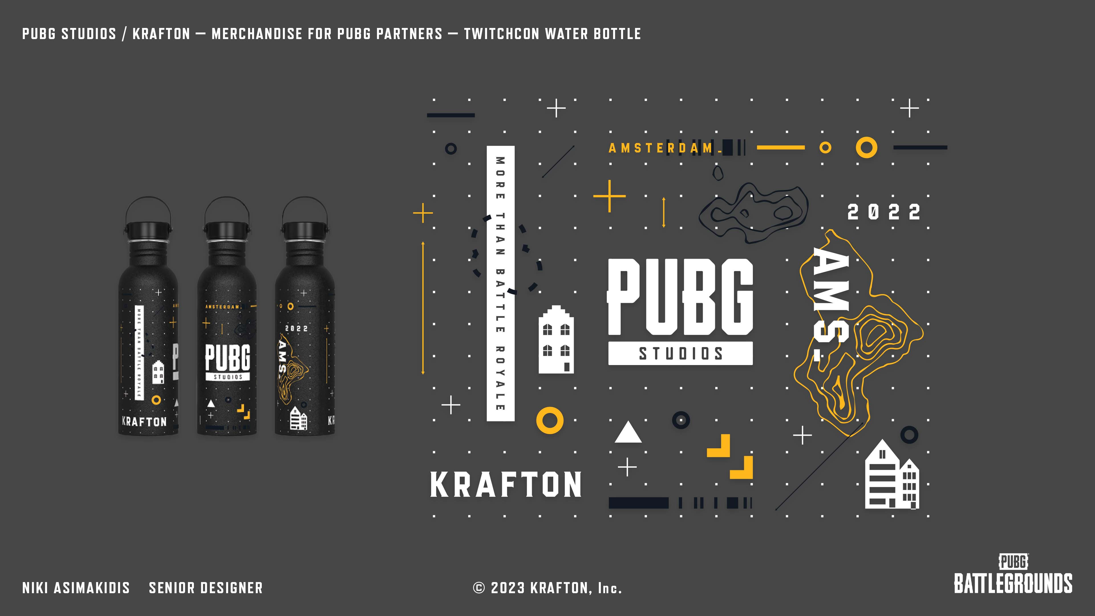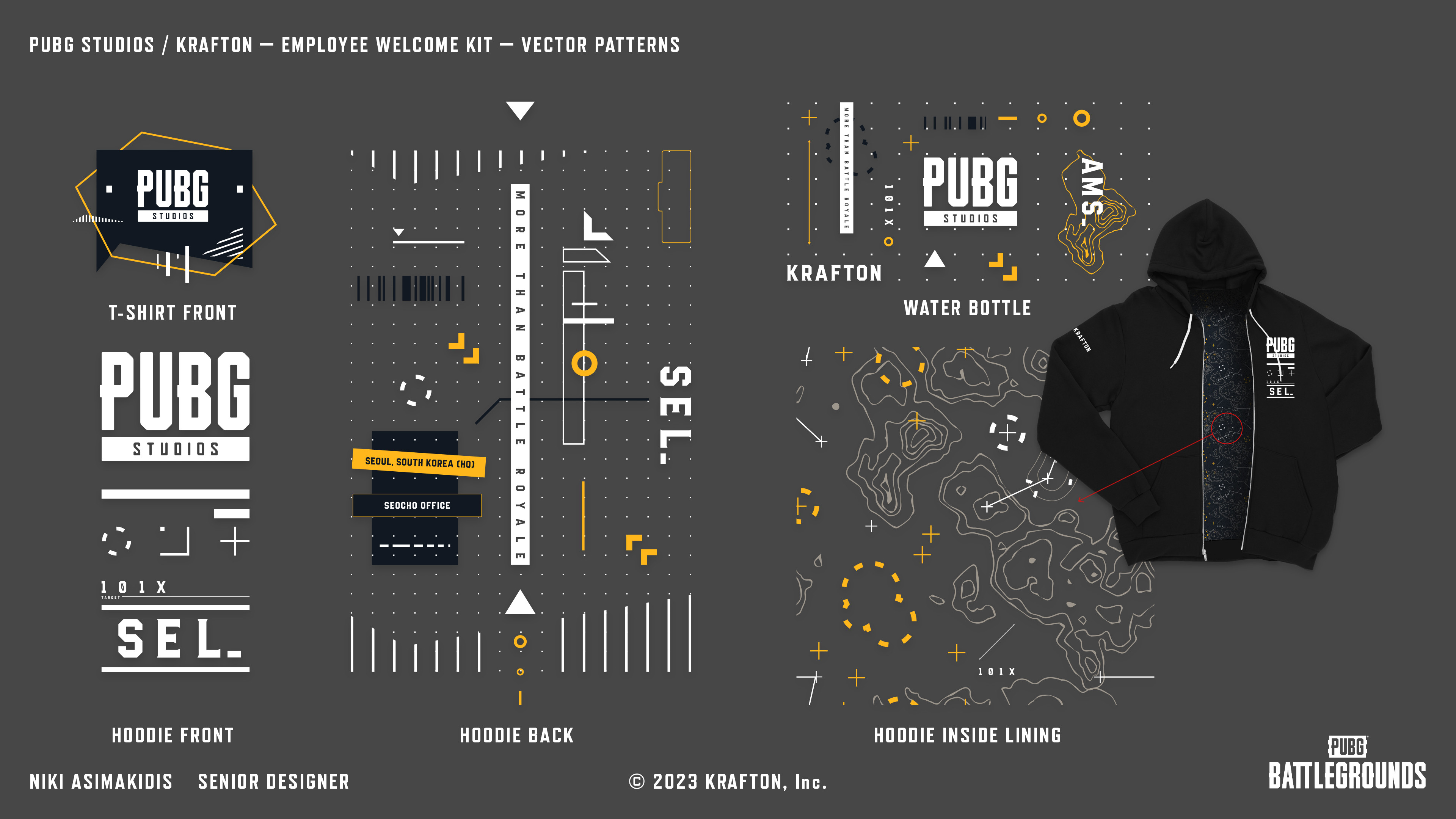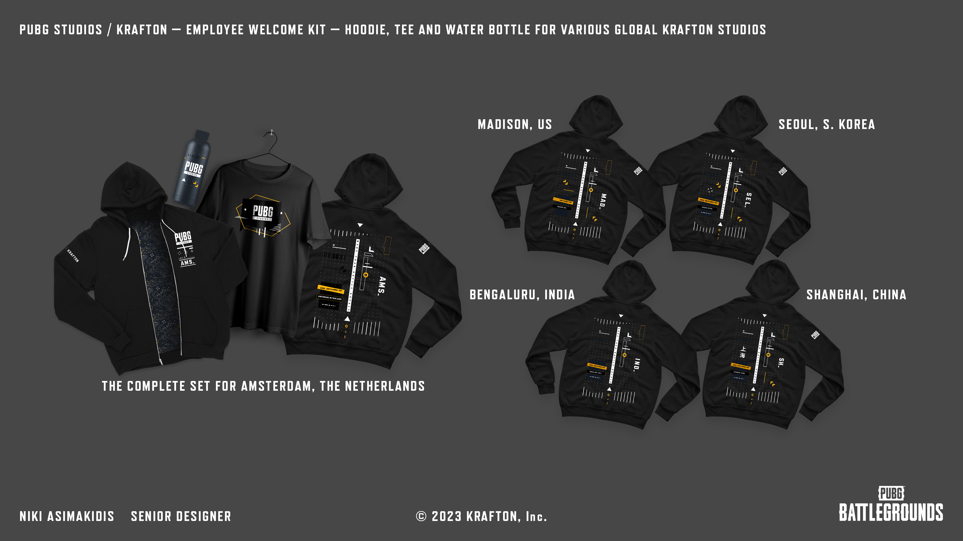 Employer welcome kit at Krafton Europe and PUBG Studios. Some of these are mockups, but all designs were product developed by my team and distributed at Krafton studios in Amsterdam, Seoul, Madison, Shanghai and Bengaluru.